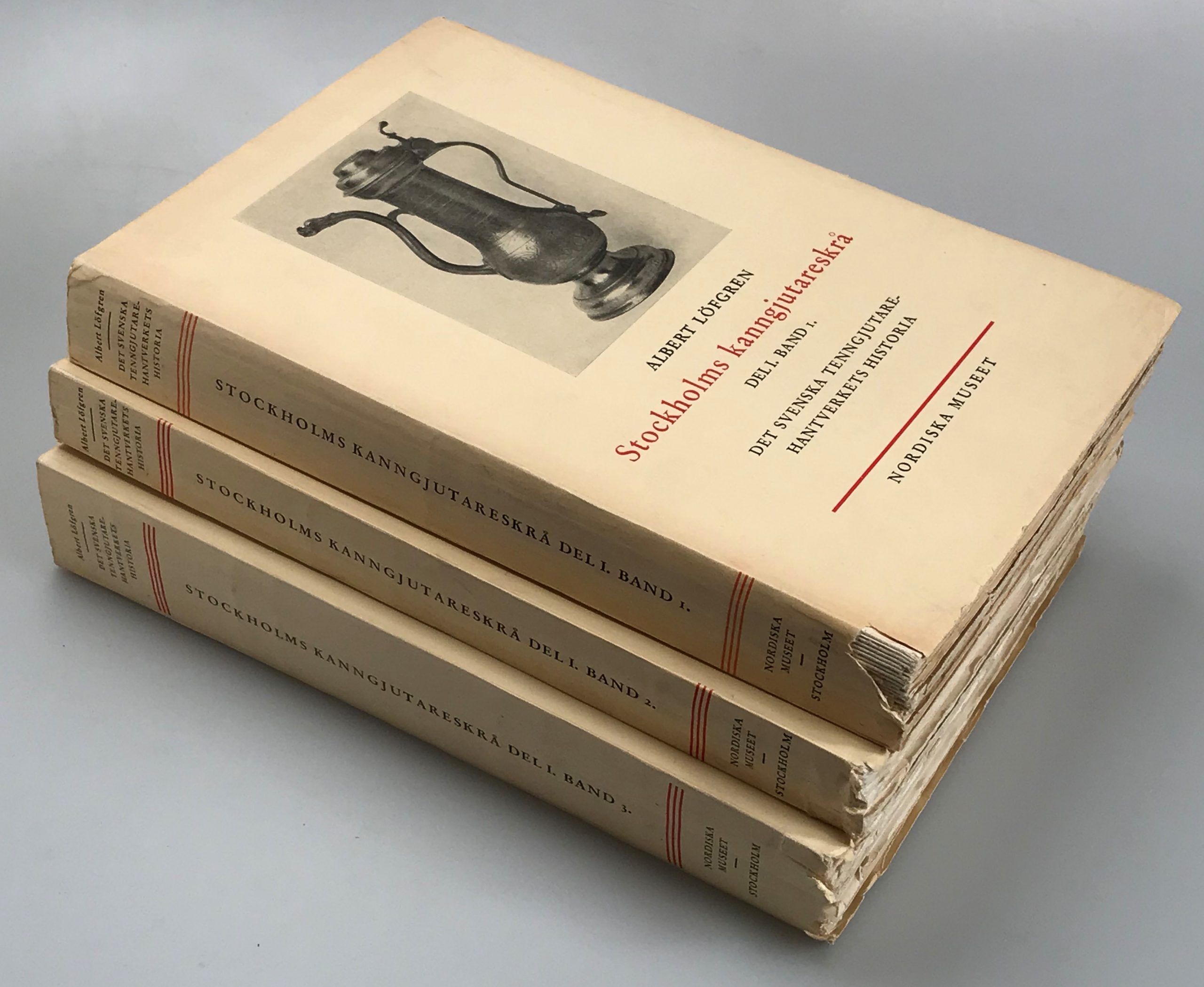 Stockholm, Lindbergs Tryckeriaktiebolag, 1936-1947. 4:o. 74, (1) s., (37) pl.-bl. + 128, (1) s., (36) pl.-bl. + 176, (1) s., (29) pl.-bl. Rikt illustrerad. Trådhäftad med styvt tryckt grått pappersomslag. 3 nästan helt ouppskurna och olästa volymer. Lätt solbrända ryggar. Del tre med antydan till vikmärke på främre omslaget.