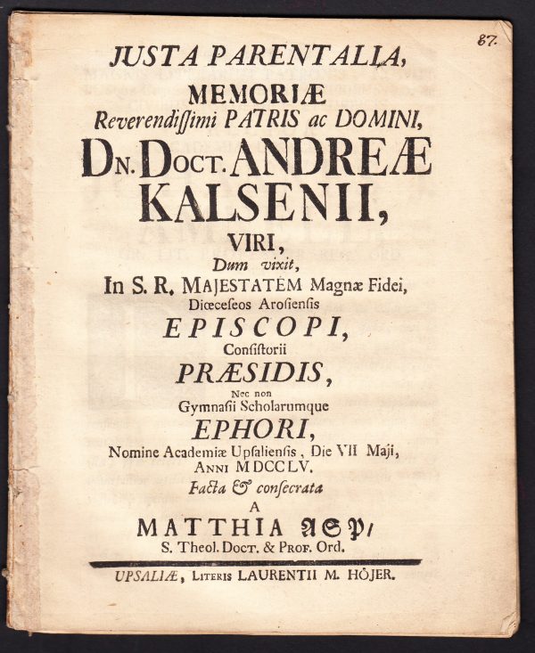 View cart “Memoriæ maxime reverendi ... Samuelis Törlingii, ante hac ecclesiæ Holmensium primariæ pastoris longe meritissimi, ut et consistorii urbici præsidis gravissimi, avunculi sui desideratissimi, cum funebria illi justa peragerentur Holmiæ v. Id. mart. a.o.r. M. DCC. XVIII, sacrum.” has been added to your cart.