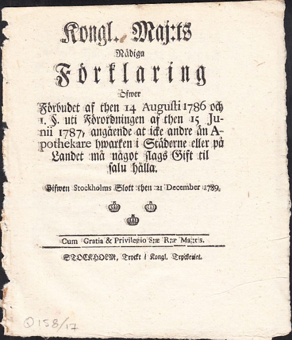 Stockholm, Tryckt uti Kongl. Tryckeriet Hos Directeuren Pet. Momma, [1743]. 4:o. (4) s. Tagen ur band. Övre inre hörn med mindre pappersförlust. Yttre marginal med svag fuktrand. Övre marginal med gammal sidnumrering, nedre marginal med gammal bläcknotering.