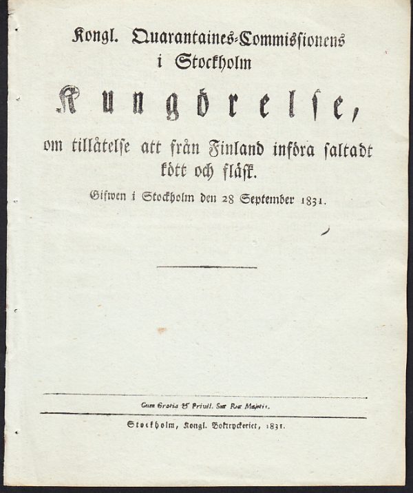 View cart “Kongl. Quarantaines-commissionens i Stockholm Kungörelse, om tillåtelse att från Finland införa saltadt kött och fläsk. Gifwen i Stockholm den 28 september 1831.” has been added to your cart.