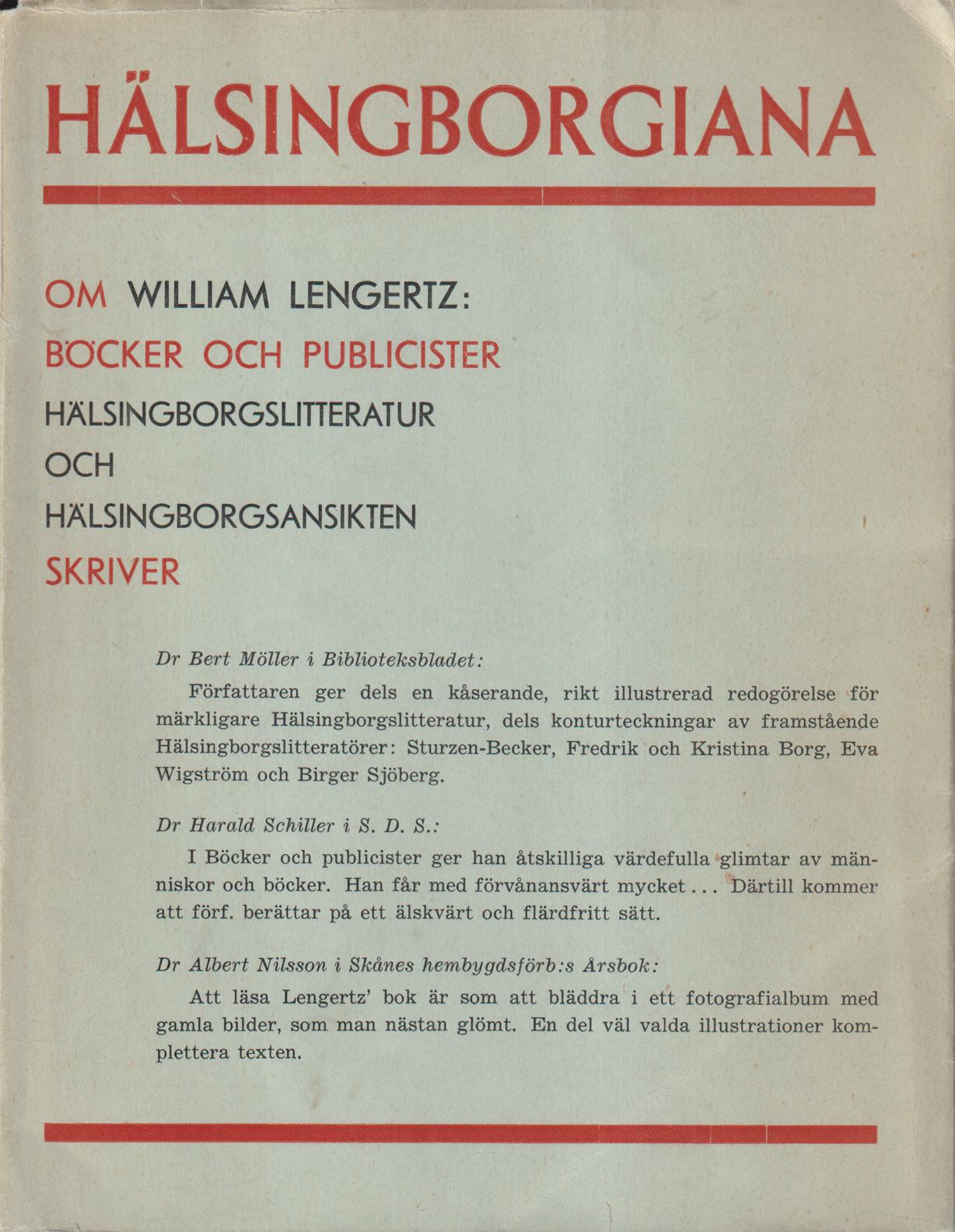 Innehåll: Glimtar av Hälsingborg med omnejd i litteraturen (Svenska och utländska resenärers intryck av staden; Jakob Wallenberg kåserar och Jac. Ekelund har en vacker dikt om Hälsingborg; Beskrivningar av allmän kartaktär, vari Hälsingborg omnämnes; Krig och örlog, Magnus Stenbock, Hälsingborgs räddare; Prästerna fordom voro goda hävdatecknare, de ha efterlämnat en rad skrifter av historiskt och topografiskt värde; Apotekare Ris, ett praktfullt original och förf. till en bizarr bok; De sista hundra åren ha talrika böcker av kulturhistoriskt innehåll utkommit om Hälsingborg; Biografi och genealogi; Arkeologiskt; Skönlitteratur och humoresker; Kommunalt tryck, sociala och ideella föreningars skrifter; LItteratur om handel, industri och sjöfart; Kuriösa småtryck och festblad; Tiden går in för turistreklam. Hälsingborg som sommarstad; Hälsobrunnen Hälsan; Ramlösa i litteraturen; Reise über den Sund och prof. Munck af Rosenschiöld; Sofiero, lustslottet vid Sundet); Publicister och minnen (Oscar Patrick Sturzen-Becker, Orvar Odd; Bilder och minnen från Öresundsposten; Eva Wigström, signaturen Ave; Birger Sjöberg, Frida-skalden).