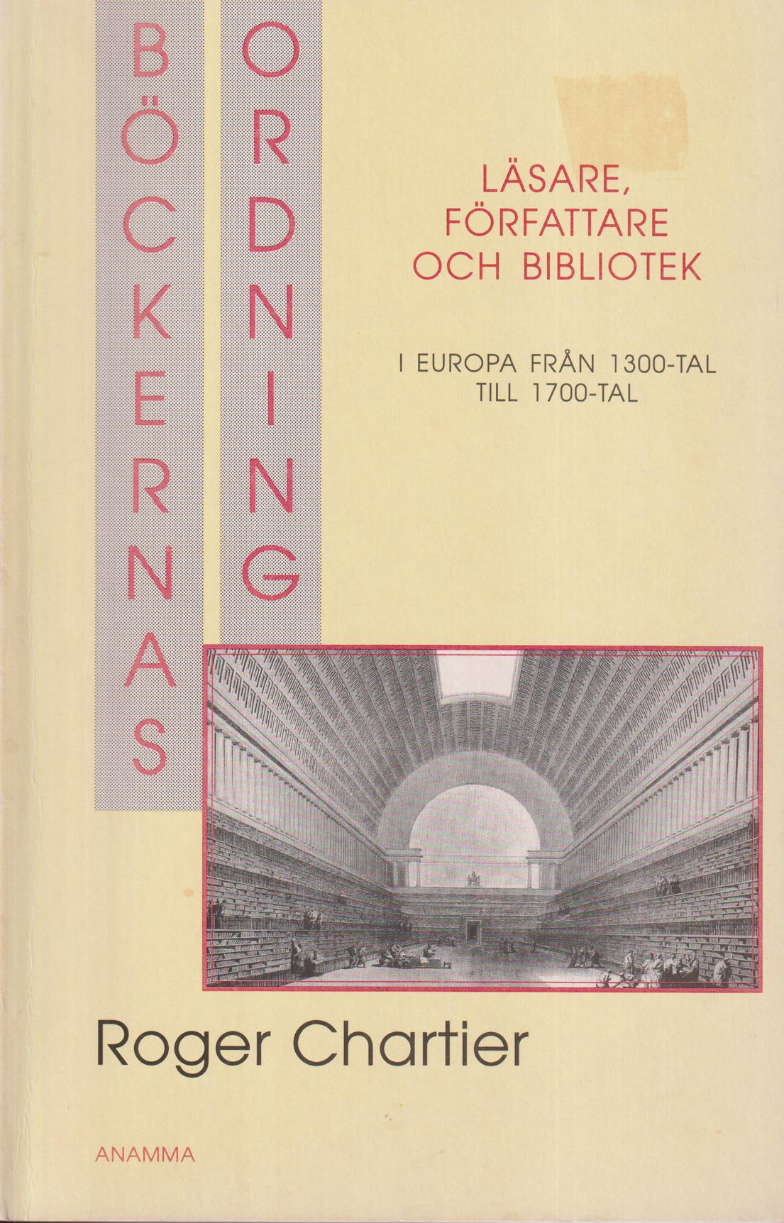 Böckernas ordning. Läsare, författare och bibliotek i Europa mellan 1300-tal och 1700-tal. Översättning av Jan Stolpe. [Utg. av] Anamma.