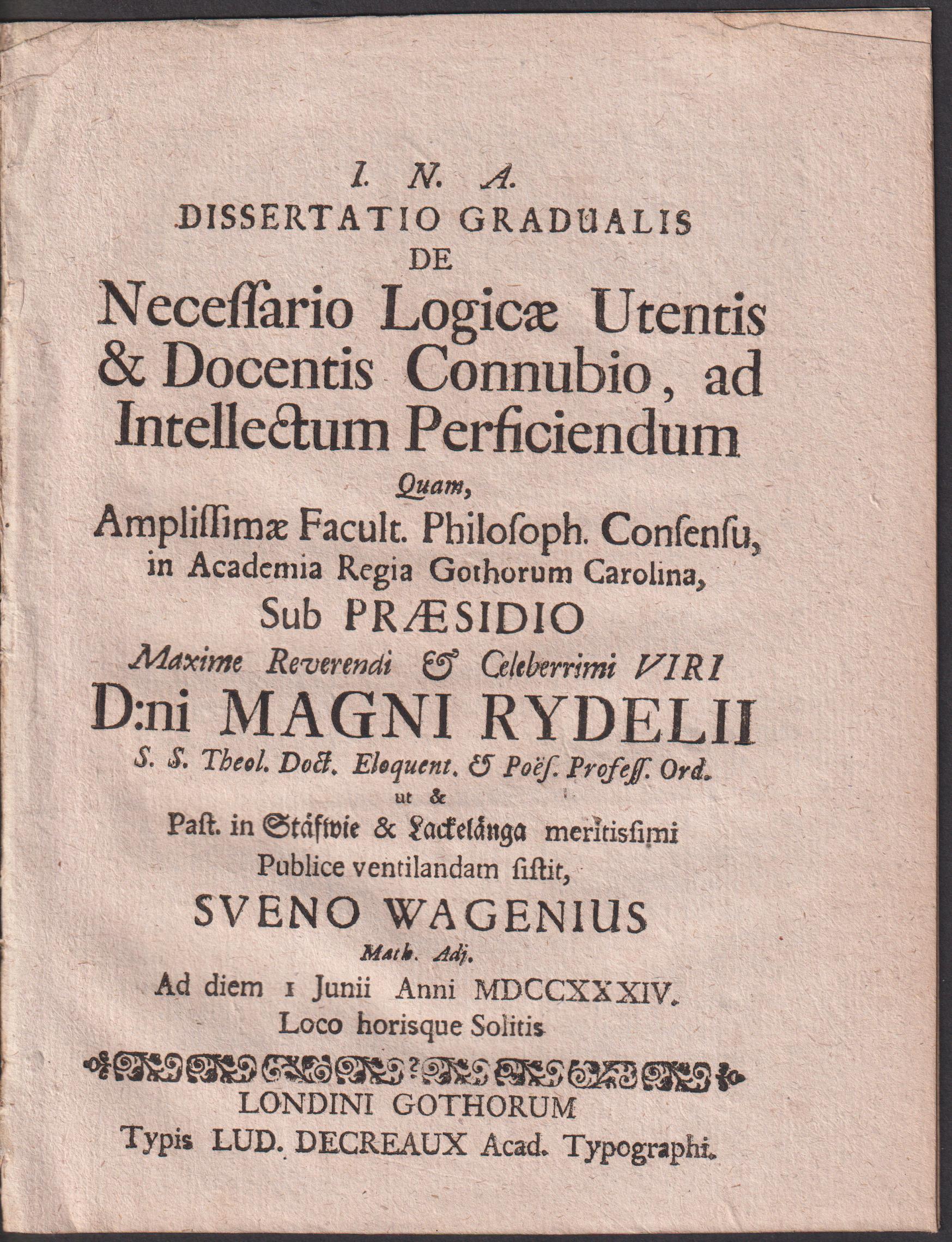 Lidén ‘Catalogus disputationum’ II:150. Setterdahl ‘Östgöta nation i Lund 1668-1913’ 6 (insp.). Modin & Söderberg ‘Matrikel öfver i Upsala studerande norrlänningar 1595-1889’, s. 60. Magnus Rydelius (1676-1742), präst och universitetslärare. Gift 1716 med Elisabeth Stobæa. Student i Uppsala 1694. Rektor vid katedralskolan i Lund 1711. Professor i historia och poesi i Lund 1715, teologie doktor 1733 samt utnämndes 1735 till tredje teologie professor. Förste teologie professor och domprost 1740. Som professor presiderade han vid hela 89 akademiska dissertationer.
