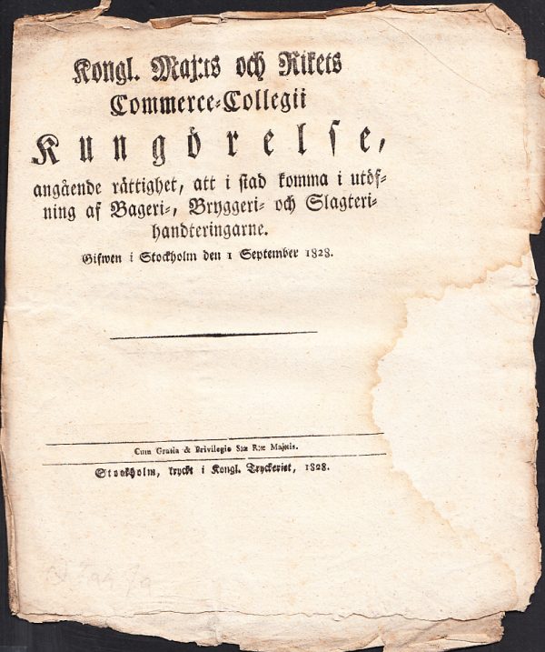 View cart “Kongl. maj:ts och Rikets Commerce-collegii Kungörelse, angående rättighet, att i stad komma i utöfning af Bageri-, Bryggeri- och Slagterihandteringarne. Gifwen i Stockholm den 1 september 1828.” has been added to your cart.