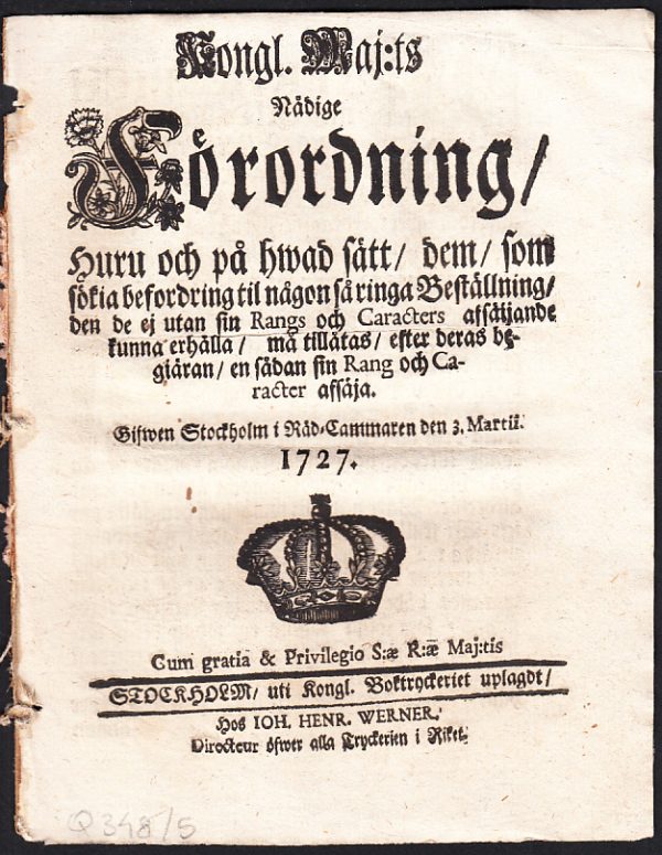 View cart “Kongl. maj:ts nådige Förordning, Huru och på hwad sätt, dem, som sökia befordring til någon så ringa Beställning, den de ej utan sin Rangs och Caracters afsäijande kunna erhålla, må tillåtas, efter deras begiäran, en sådan sin Rang och Caracter afsäja. Gifwen Stockholm i Råd-cammmaren den 3. martii. 1727.” has been added to your cart.