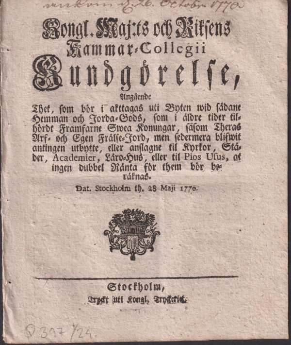 View cart “Kongl. maj:ts och Riksens Kammar-Collegii Kundgörelse, Angående Thet, som bör i akttagas uti Byten wid sådane Hemman och Jorda-Gods, som i äldre tider tilhördt Framfarne Swea Konungar, såsom Theras Arf- och Egen Frälse-Jord, men sedermera blifwit antingen utbytte, eller anslagne til Kyrkor, Städer, Academier, Läro-Hus, eller til Pios Usus, at ingen dubbel Ränta för them bör beräknas. Dat. Stockholm th. 28 maji 1770.” has been added to your cart.