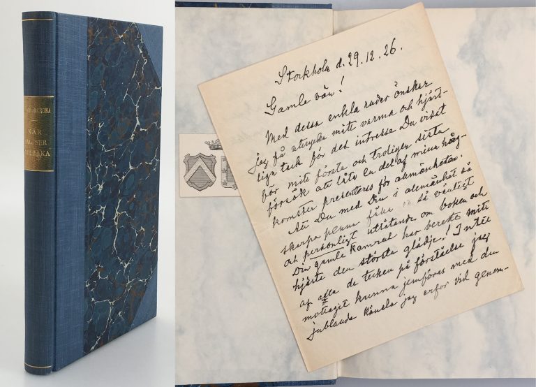 Stockholm, Iduns Kongl. Hofboktryckeri, 1901. 8:o. 151 s. Trådhäftad med styvt tryckt pappersomslag. Ägarnotering ‘Gunnar Flensburg, af Sigrid 24/12 1901’ på främre omslaget.