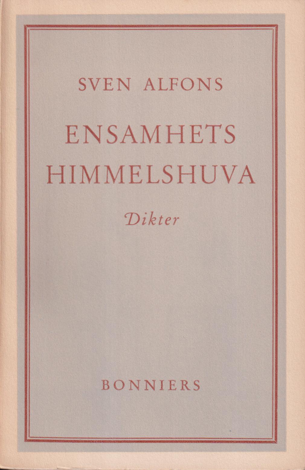 Första upplagan. Debutboken. Sven Alfons (1918-1996). Född i Lund och verksam som konsthistoriker och konstkritiker. Som lyriker debuterade han 1942 med ‘Ensamhets himmelshuva’, skrev även böcker om Carl Larsson och Arcimboldo.