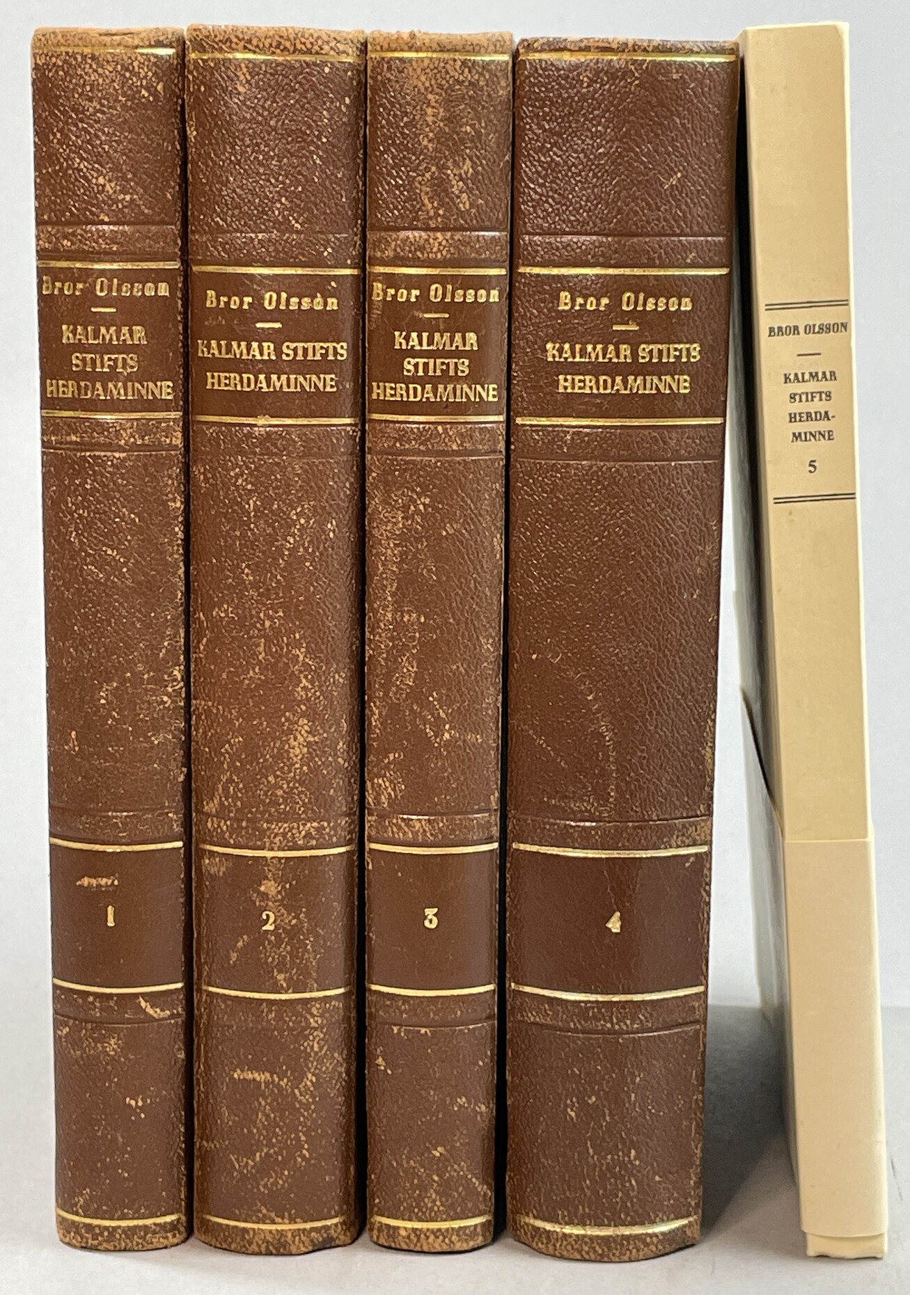 Lund, Berlingska Boktryckeriet, 1947-1951 & Uppsala, BPV-offset, 1980. 8:o. 326 s, (1) pl.-bl. + 386, (1) s., (1) pl.-bl. + 298, (1) s., (1) pl.-bl. + 543 s., (1) pl.-bl. + (3), x, 210, (1) s., (1) pl.-bl. Rikt illustrerad. Förlagets bruna något nötta halvskinnband med fyra markerade bind, markerade titel och deltitelfält samt sigilldekor i guldtryck på främre pärm. Övre guldsnitt. 4 volymer + 1 häfte (del 5). Tryckt för kyrkoherden Harry Brodmar (enl. bilagd subskribtionsförteckning).