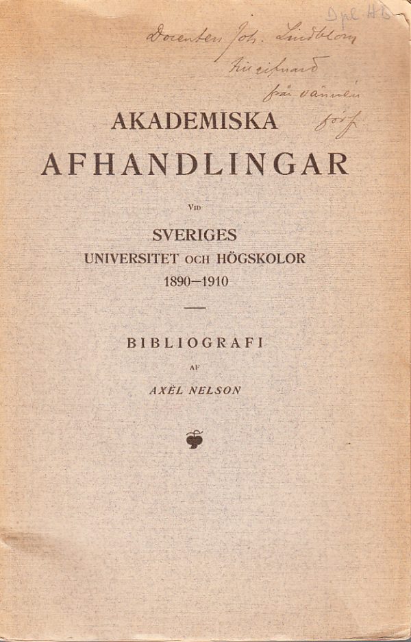View cart “Akademiska afhandlingar vid Sveriges universitet och högskolor läsåren 1890/91-1909/10 jämte förteckning öfver svenskars akademiska afhandlingar vid utländska universitet under samma tid. Bibliografi af Axel Nelson.” has been added to your cart.