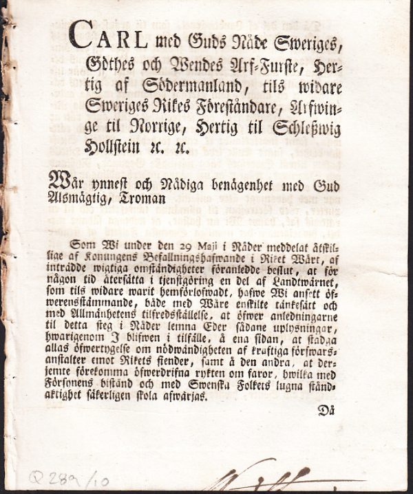 Stockholm, uti det Kongl. Tryckeriet, Hos Joh. Henr. Werner, Directeur öfwer alla Tryckerien i Riket, Åhr 1726 [!]. 4:o. (4) s. Med graverad titelvinjett. Tagen ur band. Nedre marginal med spår av gammal bläcknotering (något skuren) om platsen för uppläsandet. Inre marginal med pappersförlust (ca 10x10 mm) efter bokmasken.