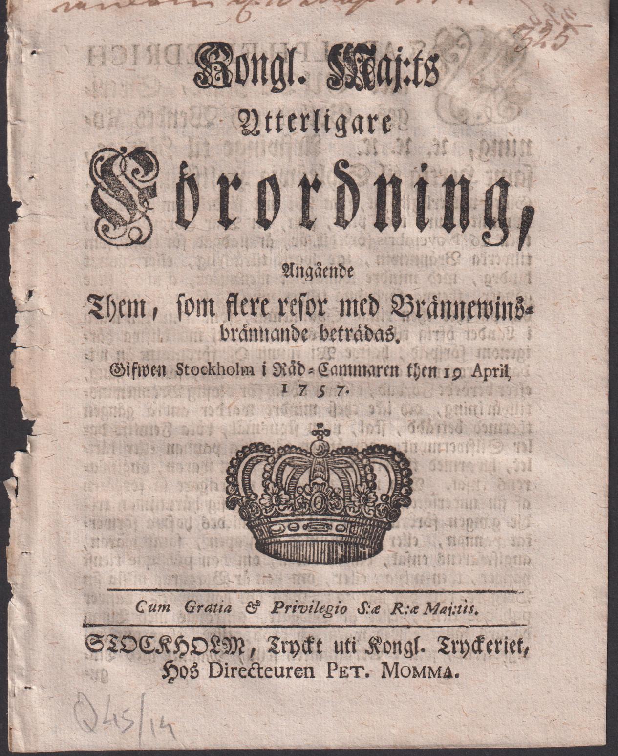 Kongl. maj:ts Ytterligare Förordning, Angående Them, som flere resor med Brännewinsbrännande beträdas. Gifwen Stockholm i Råd-Cammaren then 19 april 1757.