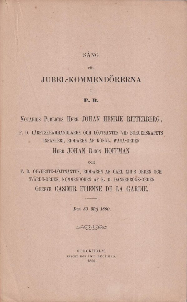 View cart “Sång för jubel-kommendörerna i P.B. Notarius Publicus herr Johan Henrik Ritterberg, F.d. lärftskramhandlaren och löjtnanten vid borgerskapets infanteri, riddare af Kongl. Wasa-Orden herr Johan D:son Hoffman och F.d. öfverste-löjtnanten, riddaren af Carl XIII:s orden och Svärds-orden, kommendören af K.D. Dannebrogs-orden grefve Casimir Etienne de la Gardie. Den 30 maj 1860.” has been added to your cart.