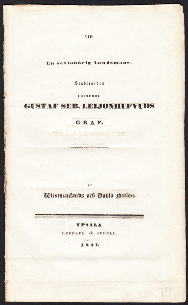 View cart “Vid en sextonårig landsmans, studeranden friherre Gustaf Seb. Leijonhufvuds graf. Af Westmanlands och Dahla nation.” has been added to your cart.