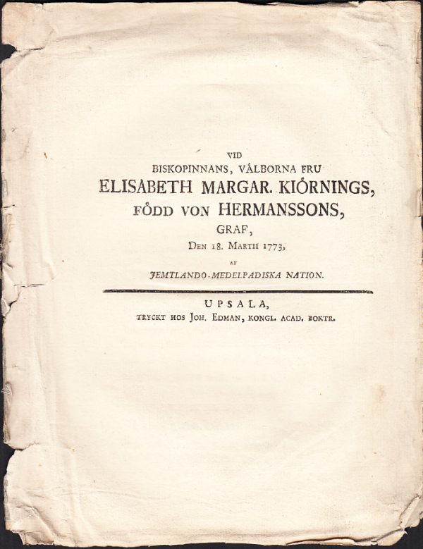 View cart “Vid biskopinnans, välborna fru Elisabeth Margar. Kiörnings, född von Hermanssons, graf, den 18. martii 1773, af Jemtlando-Medelpadiska nation.” has been added to your cart.