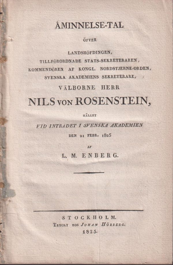 View cart “Åminnelse-tal öfver landshöfdingen, tillförordnade stats-sekreteraren ... Nils von Rosenstein, hållet vid inträdet i Svenska Akademien den 21 febr. 1825. Af L.M. Enberg.” has been added to your cart.