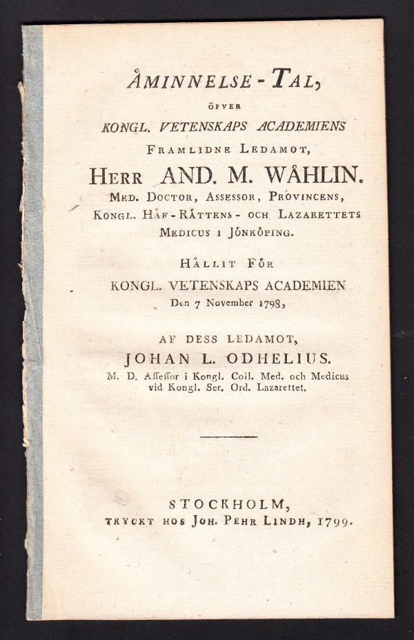 View cart “Åminnelse-tal, öfver kongl. vetenskaps academiens framlidne ledamot, herr And. M. Wåhlin. ... provincens, kongl. håf-rättens- och lazarettets medicus i Jönköping. Hållit för kongl. vetenskaps academien den 7 november 1798, af dess ledamot, Johan L. Odhelius. ...” has been added to your cart.