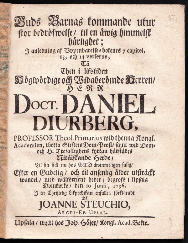 View cart “Guds barnas kommande utur stor bedröfwelse, til en äwig himmelsk härlighet; i anledning af Vppenbarelse- bokenes 7 capitel, 13, och 14 verserne, tå ... Daniel Diurberg, professor theol. primarius wid thenna kongl. academien, thetta stiftets dom-prost, samt wid dom- och H. Trefallighets kyrkan härstädes nitälskande herde, til sin siäl nu hos Gud äwinnerligen salig, efter en gudelig, och til ansenlig ålder utsträckt wandel, med wälförtient heder, begrofs i Upsala domkyrko, den 10 junii, 1736. I en christelig likpredikan enfallel. förklaradt af Joanne Steuchio ...” has been added to your cart.
