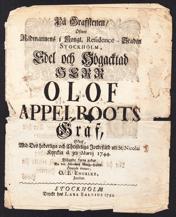 View cart “På grafstenen, öfwer rådmannens i kongl. residence-staden Stockholm, edel och högacktad herr Olof Appelroots graf, skref, wid des hederliga och christeliga jordefärd uti St. Nicolai kyrckia d. 30 martij 1744. Följande korta rader en det förnäma sorg-husets ödmiuke tienare, O.F. Engelke, junior.” has been added to your cart.