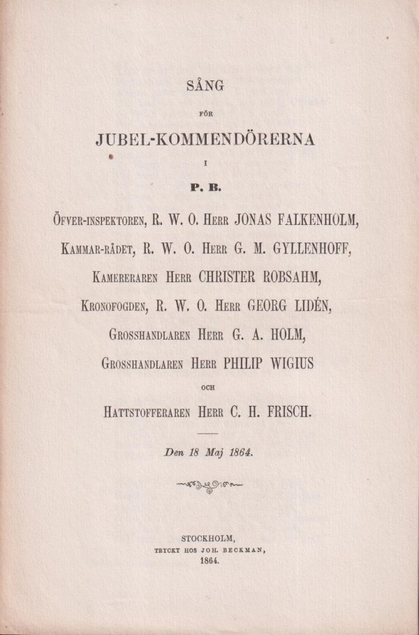 View cart “Sång för jubel-kommendörerna i P.B. Öfver-inspektoren, R.W.O. herr Jonas Falkenholm, Kammar-rådet, R.W.O. herr G.M. Gyllenhoff, Kamreraren herr Christer Robsahm, Kronofogden, R.W.O. herr Georg Lidén, Grosshandlaren herr G.A. Holm, Grosshandlaren herr Philip Wigius, och Hattstofferaren herr C.H. Frisch. Den 18 maj 1864.” has been added to your cart.