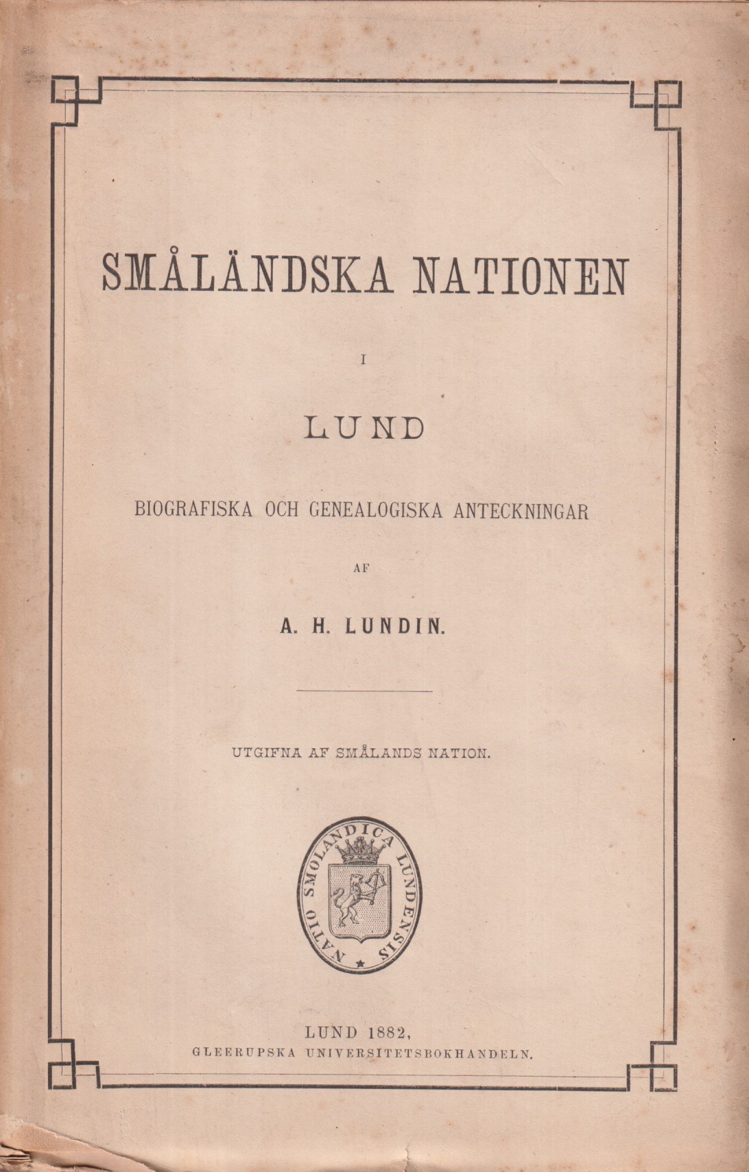 Småländska nationen i Lund. Biografiska och genealogiska anteckningar af A. H. Lundin. Utgifna af Smålands nation.