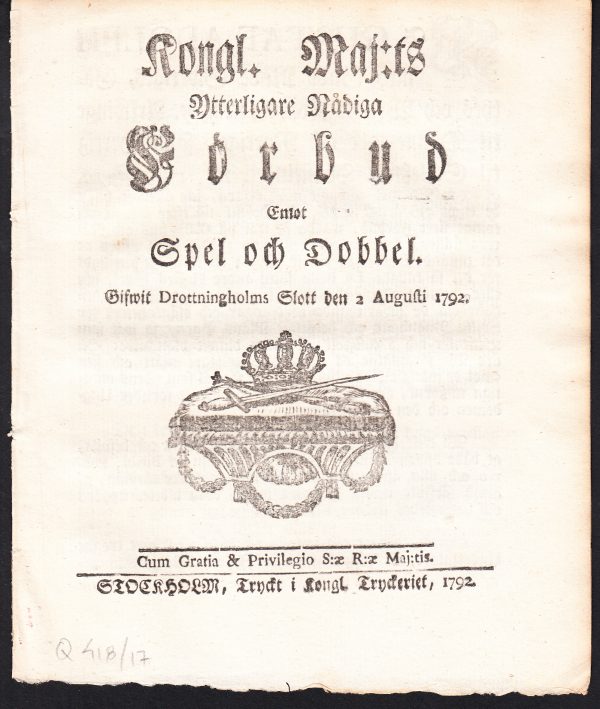 View cart “Kongl. Maj:ts Ytterligare Nådiga Förbud Emot Spel och Dobbel. Gifwit Drottningholms Slott den 2 augusti 1792.” has been added to your cart.