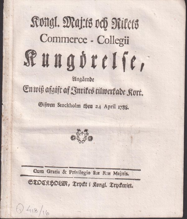 View cart “Kongl. Maj:ts och Rikets Commerce-Collegii Kungörelse, Angående En wisz afgift af Inrikes tilwerkade Kort. Gifwen Stockholm then 24 April 1788.” has been added to your cart.