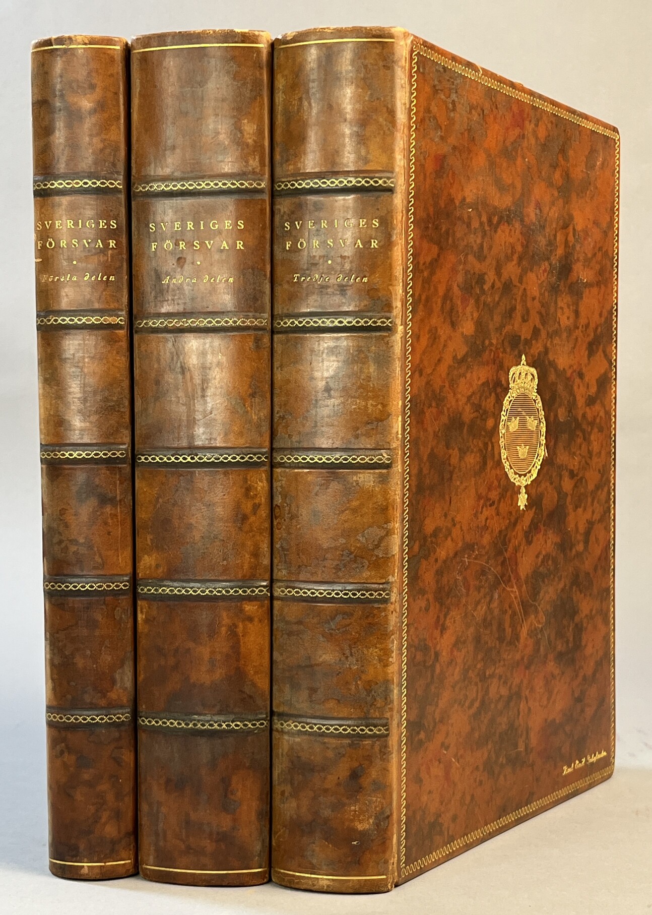Stockholm, A.-B. Hasse W. Tullbergs Boktryckeri, 1927-1928. 4:o. 280 s. + 440 s. + 396 s. Illustrerad. Förlagets rödbruna rotmarmorerade skinnband med fem upphöjda bind, ryggtitel & pärmdekor ‘Lilla riksvapnet’ i guld. 3 välhållna volymer. Lätt solblekta ryggar. Främre pärm med ägarnamnet ‘Karl Emil Schylander’ präglat.