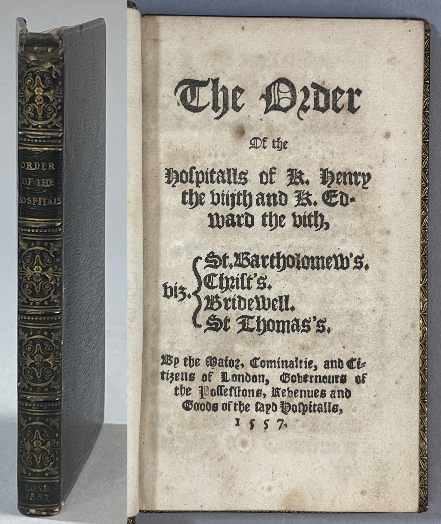 The Order of the Hospitalls of K. Henry the viiith and K. Edward the vith, viz. St. Bartholomew's, Christ's, Bridewell, St. Thomas's. By the Maior, Cominaltie, and Citizens of London, Governours of the Possessions, Revenues and Goods of the sayd Hospitalls, 1557.