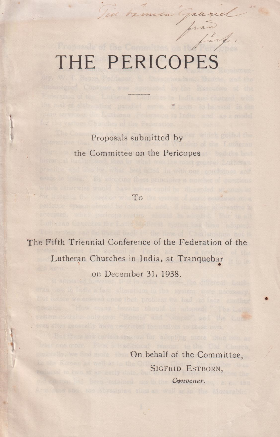 The Pericopes. Proposals submitted by the Committee on the Pericopes to The Fifth Triennial Conference of the Federation of the Lutheran Churches in India, at Tranquebar on December 31, 1938.