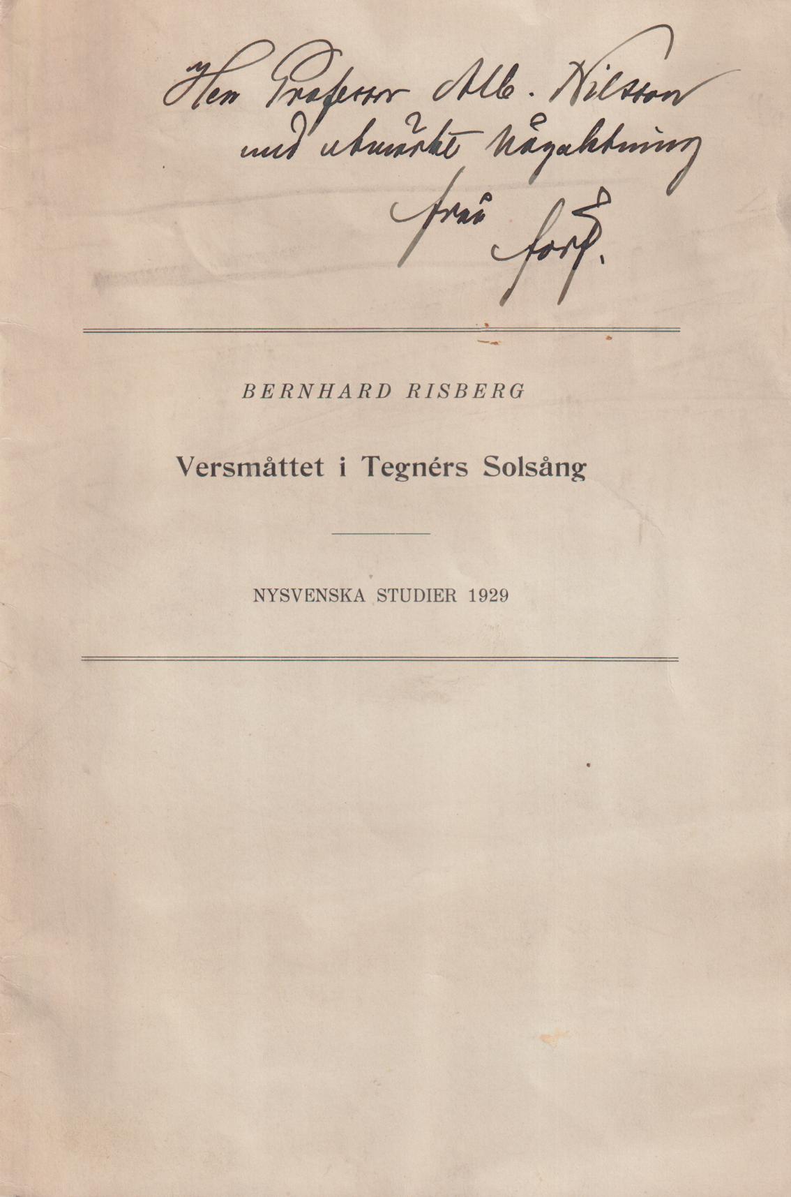 Uppsala, Appelbergs Boktryckeri Aktiebolag, 1929. 8:o. s. [79]-87. Klammerhäftad med styvt tryckt pappersomslag. Något solkigt omslag. Tillskrift ‘Herr Professor Alb. Nilsson / med utmärkt högaktning / från förf.’ på främre omslaget.