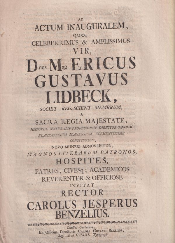 View cart “Ad actum inauguralem, quo celeberrimus & amplissimus vir, D:nus mag. Ericus Gustavus Lidbeck ... Sacra regia majestate, historiæ naturalis professor & director omnium plantationem scanensium clementissime constitutus, hospites, patres, civesq; academicos reverenter & officiose invitat rector Carolus Jesperus Benzelius.” has been added to your cart.