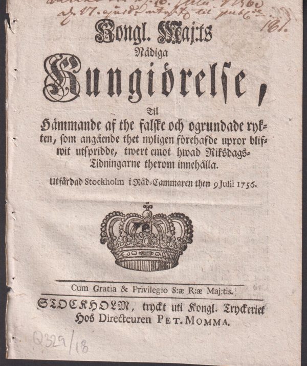 View cart “Kongl. Maj:ts Nådiga Kungiörelse, Til Hämmande af the falske och ogrundade rykten, som angående thet nyligen förehafde upror blifwit utspridde, twert emot hwad Riksdags-Tidningarne therom innehålla. Utfärdad Stockholm i Råd-Cammaren then 9 Julii 1756.” has been added to your cart.